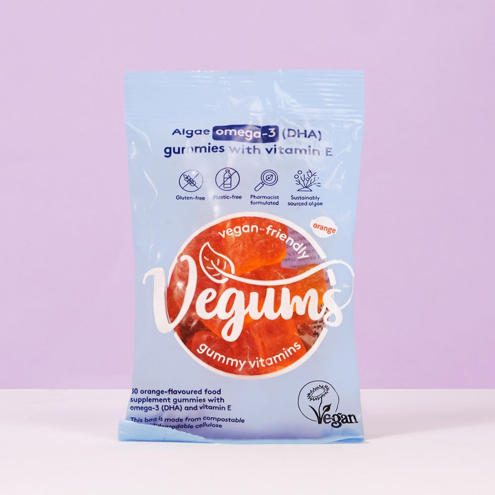 Vegums visvrije omega-3 gummies bevatten plantaardige omega-3 uit zeealgen. Een perfecte oplossing voor mensen die vegan of vegetarisch eten of liever geen visolie nemen. De omega-3 gummies van Vegums zijn helemaal plantaardig, gluten- en palmolievrij en zijn gecertificeerd door The Vegan Society.