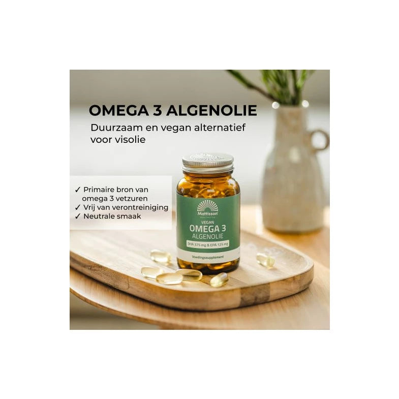 Algenolie is een 100% plantaardig Omega 3 supplement en een duurzame en vegan vervanger voor Omega 3 uit visolie. DHA is een belangrijke bouwsteen voor de hersenen en EPA en DHA dragen bij tot de normale werking van het hart. Het gunstige effect wordt verkregen bij een dagelijkse inname van 250 mg EPA en DHA.