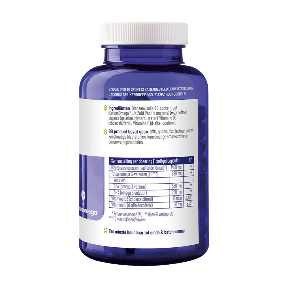 Visolie 1400 TG Sport bevat geen: GMO, gluten, gist, lactose, suiker, kunstmatige kleurstoffen, smaakstoffen of conserveringsmiddelen.